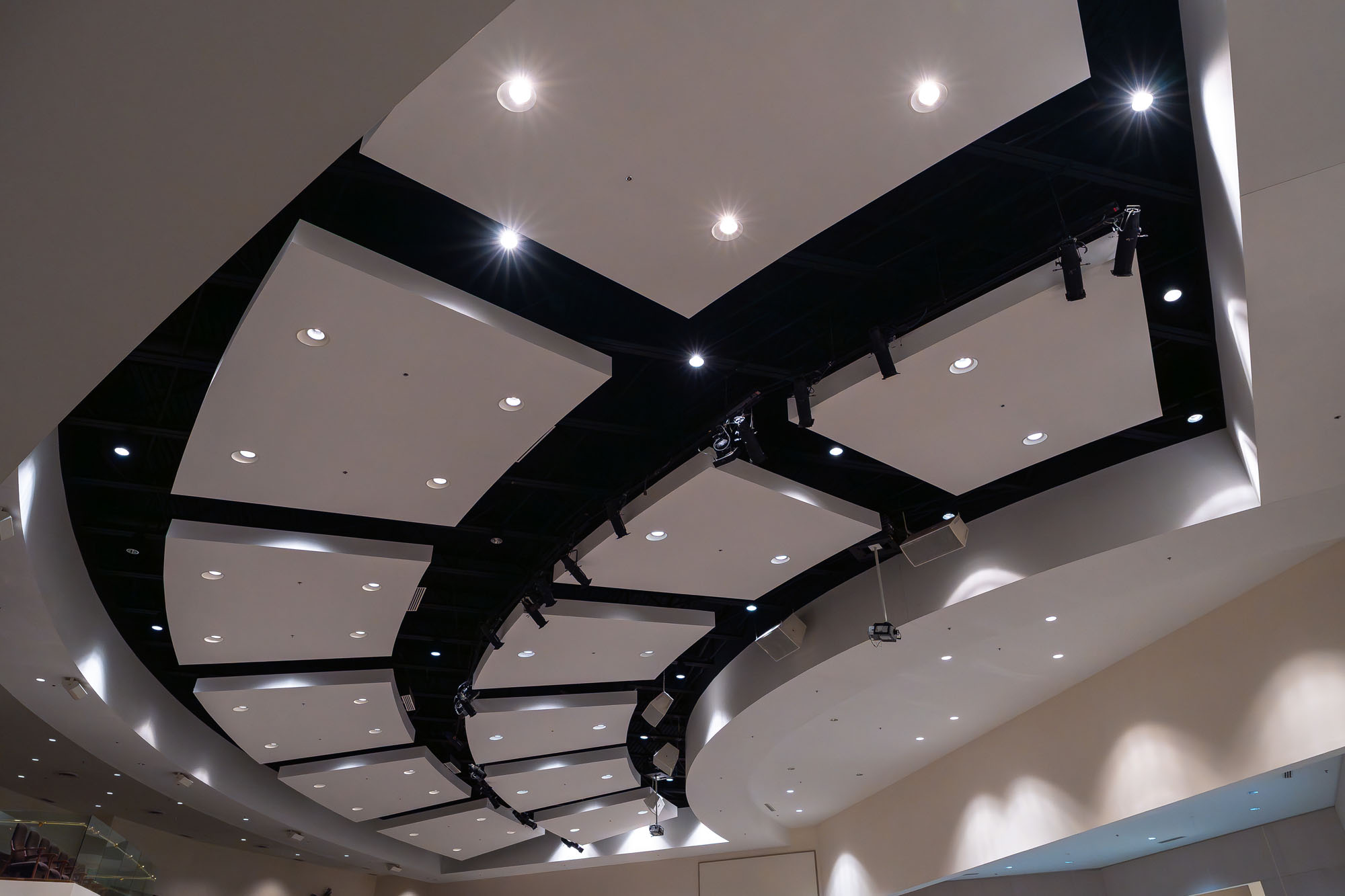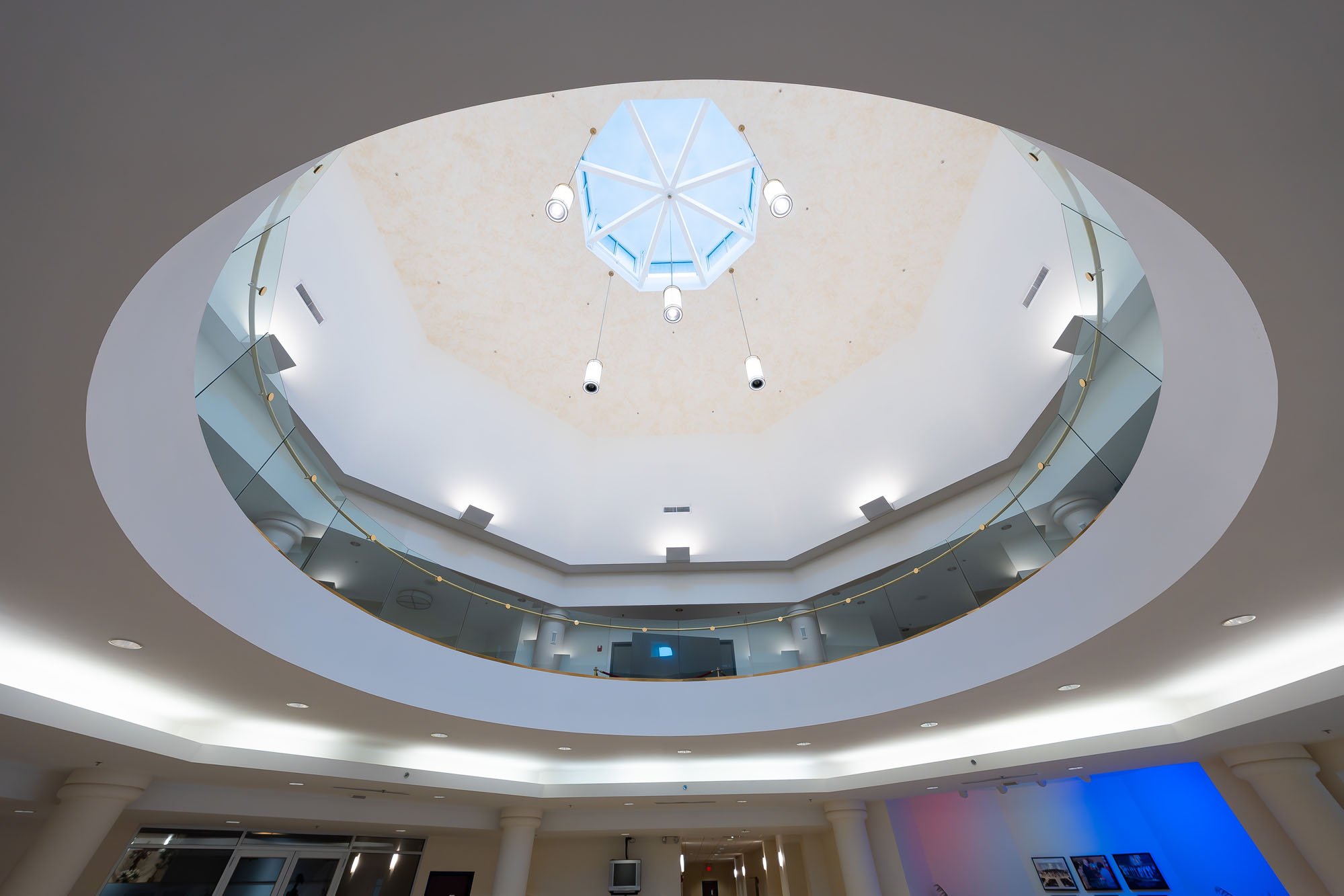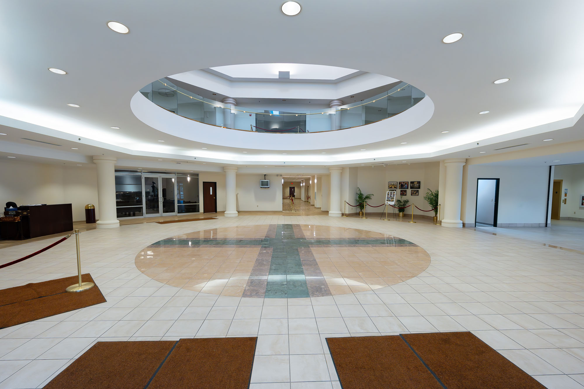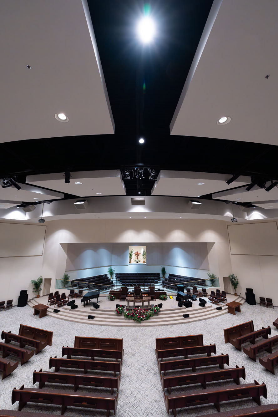 Throughout the design process, discussions were had about avoiding placing columns in the sanctuary so that the pulpit, stage, and baptismal pool were visible from every seat on the first floor. The decision to add the optional second-floor mezzanine proved to be essential decades later. From an architectural and interior finishes perspective, the entrance, the two-story atrium with dome rotunda, sanctuary, and supporting spaces reflected a reverence for the church. As a house of worship, being functional and visually pleasing were equally important. The team created a texture, color, and lighting palette that fostered an inviting, warm atmosphere that was also appropriate for hosting social gatherings.